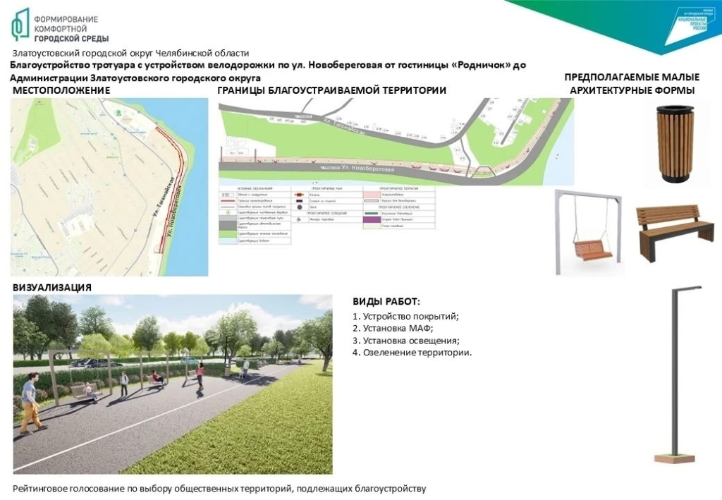 – тротуар с устройством велодорожки по ул. Новобереговая от гостиницы «Родничок» до администрации Златоустовского городского округа;