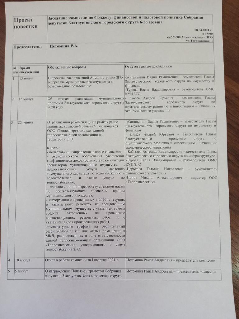 8 апреля 2021 г. на заседании комиссии по бюджету, финансовой и налоговой политике депутаты комиссии заслушали отчет экономического управления о реализации муниципальных программ на территории ЗГО за 2020 год и в очередной раз вернулись к вопросу о работе ООО «Теплоэнергетик» как единой теплоснабжающей организации, чтобы рассмотреть выполненные мероприятия по реализации рекомендаций комиссии, изложенных в решении комиссии от 04.03.2021 г. № 64.