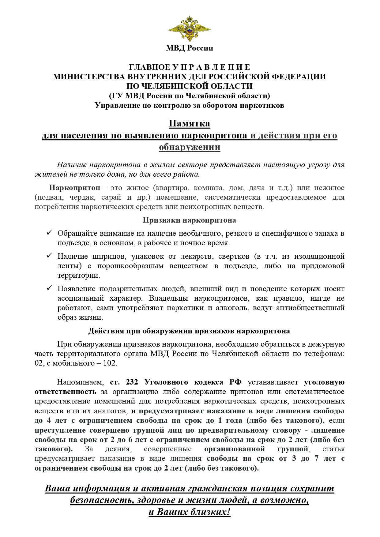 Памятка для населения по выявлению наркопритона и действия при его обнаружении