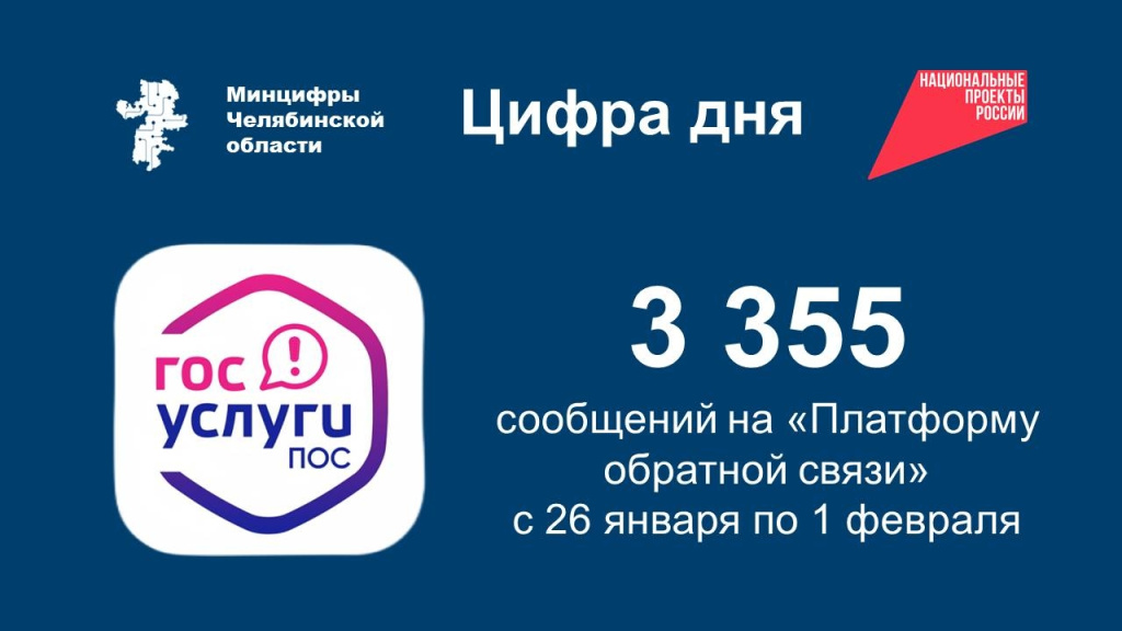 Всего с 26 января по 1 февраля поступило 3 355 сообщений через Платформу обратной связи от жителей Челябинской области.