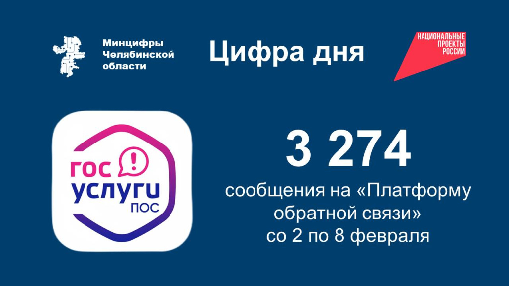 Всего со 2 по 8 февраля поступило 3 274 сообщения через Платформу обратной связи от жителей Челябинской области.