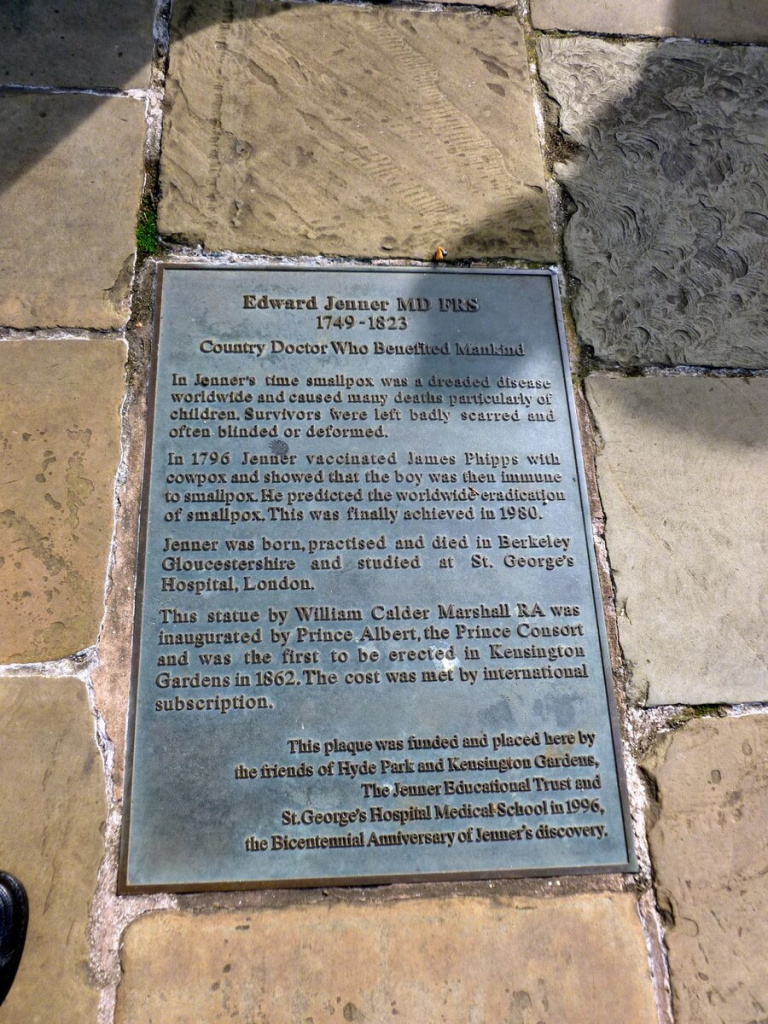 В 1858 году принц-консорт Альберт торжественно открыл в Лондоне на Трафальгарской площади бронзовый памятник Эдварду Дженнеру. Этот памятник есть и сейчас, только находится он в Кенсингтонских садах, куда его перенесли после мощной компании, устроенной противниками вакцинации в 1862 году.