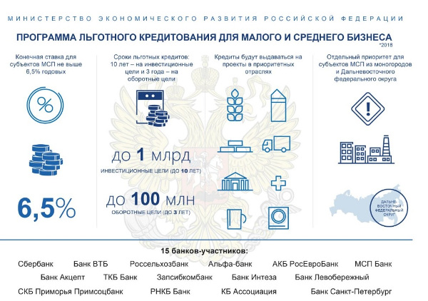 Получить льготный кредит предприниматели могут в 15 банках: Банк ВТБ, Сбербанк, "Россельхозбанк", "Банк Акцепт", "Альфа-банк", КБ "Ассоциация", Банк "Левобережный", "Банк Интеза", "Запсибкомбанк", МСП Банк, СКБ Приморья "Примсоцбанк", "РосЕвроБанк", "Банк "Санкт-Петербург", РНКБ Банк, ТКБ Банк.